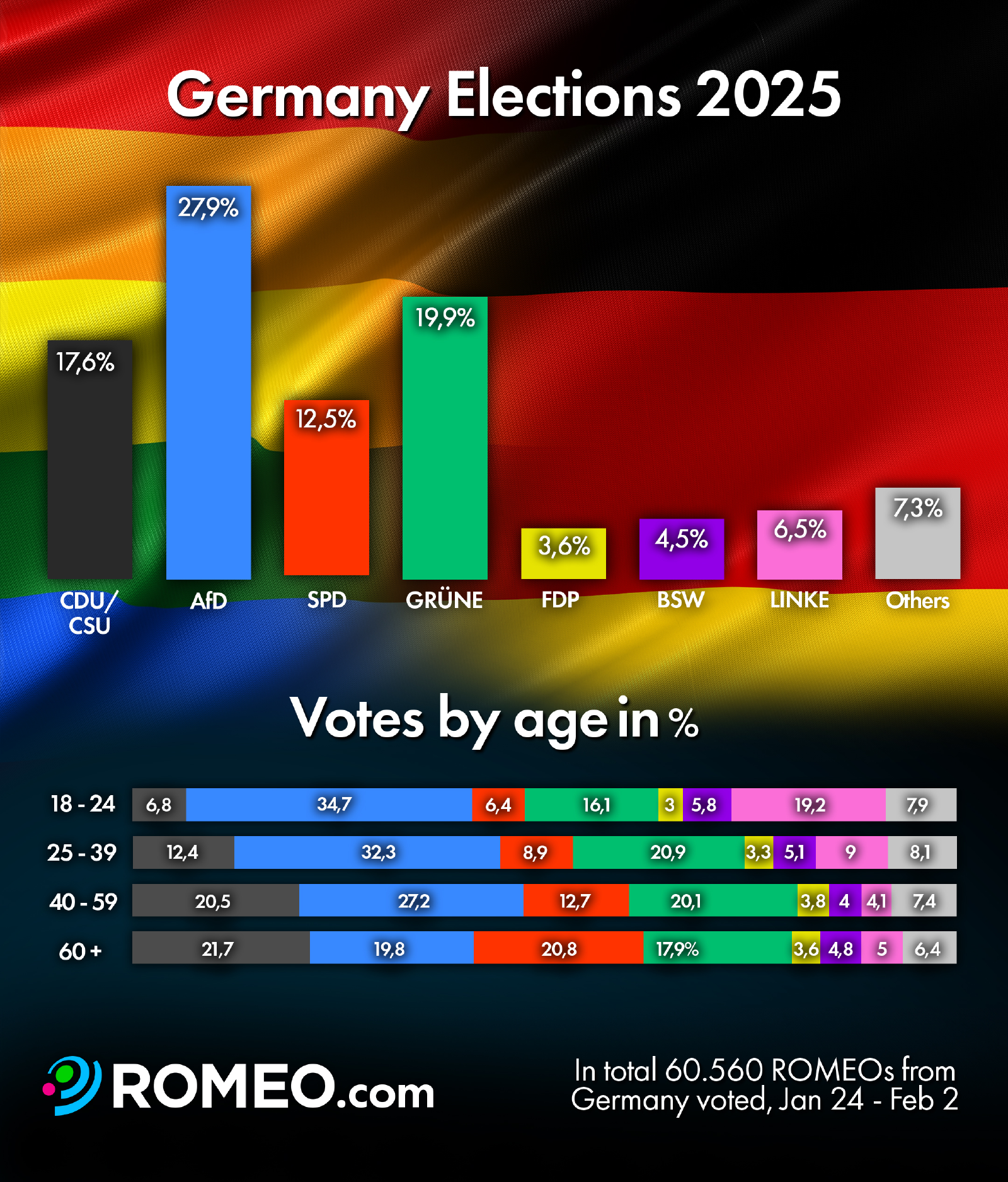The Alternative for Germany (AfD) recorded the highest level of support among users of the Romeo dating platform, which is aimed at gay and bisexual men. In a poll conducted from January 24 to February 2, more than 60,000 respondents reported their preferences for the federal election. The AfD received 27.9% of the vote. At a clear distance were the Greens (19.9%), the Christian Democratic Union (17.6%), and the Social Democratic Party of Germany (12.5%).