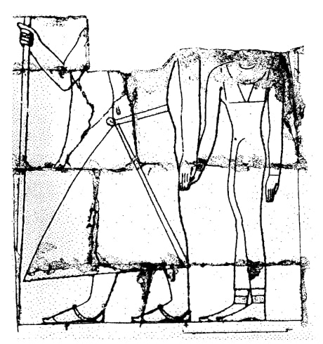 Debajo de las figuras sentadas hay cinco filas de representaciones. La tercera fila muestra a diez figuras; el hombre y la mujer que van a la cabeza posiblemente sean los padres de los dueños de la tumba. Cerrando la fila están Nianjjnum y Jnumhotep. Van cogidos de la mano: Nianjjnum guía a su compañero. La mujer de la primera pareja y Jnumhotep son los únicos personajes que cogen a su pareja de la mano en lugar de llevársela al pecho. El espectador ve una yuxtaposición visual de una pareja heterosexual y otra homosexual.