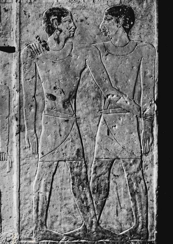 En la piedra, entre dos puertas falsas, estaban tallados los dos hombres abrazándose. Los arqueólogos nunca antes habían visto representaciones similares en ninguna tumba.