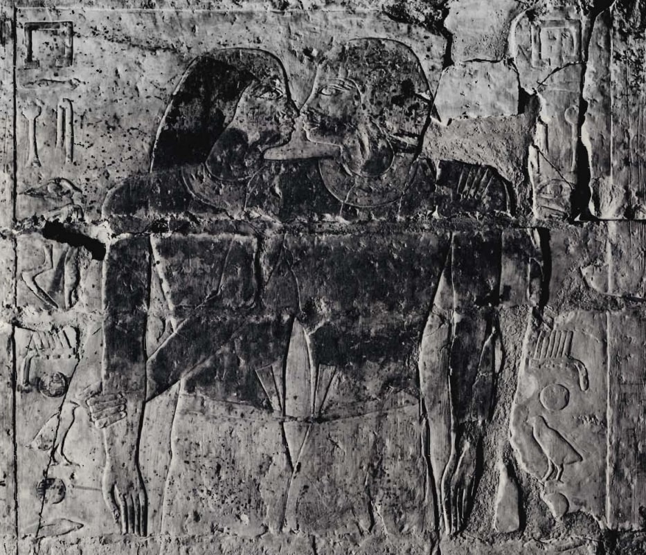 La escena más íntima está tallada en la cara interior de la columna de entrada, frente a las falsas puertas. Los hombres están solos. Aparecen más cerca de lo que se muestra a un marido y una mujer en otras tumbas. Los nudos de sus cinturones se tocan y sus caras están nariz con nariz. El artista representó, probablemente, un beso: en el Imperio Antiguo, esta palabra se indicaba con el jeroglífico de narices tocándose.